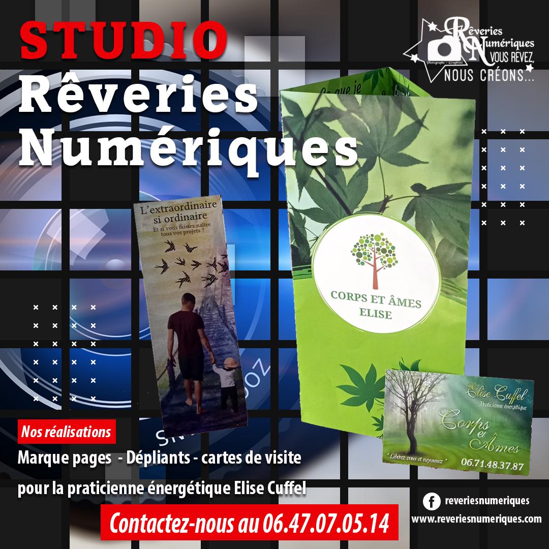 Un grand merci pour la confiance accordée depuis quelques années par la praticienne énergétique Elise Cuffel du Centre Corps et Ames de Dourlers qui a fait appel aux services du Studio Rêveries Numériques pour la création et l'impression de ses cartes de visite, dépliants et marque pages pour l'ouvrage dont elle est l'auteure, "L'extraordinaire si ordinaire"