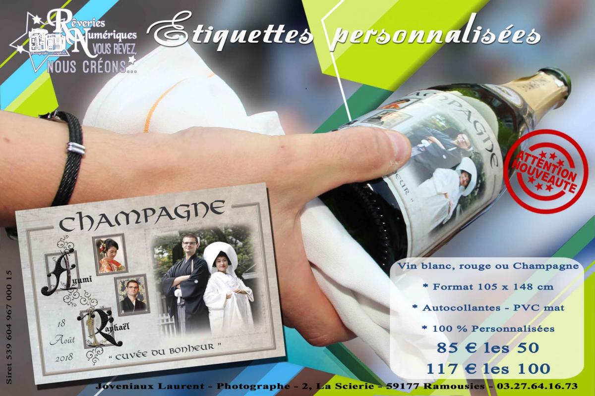 - Les étiquettes sont personnalisées (avec ou sans photo) par le Studio Rêveries Numériques à 100 % les rendant ainsi uniques et originales. Cela vous permet en outre d'harmoniser votre approche graphique avec vos faire-parts, vos menus, cartes de remerciements.